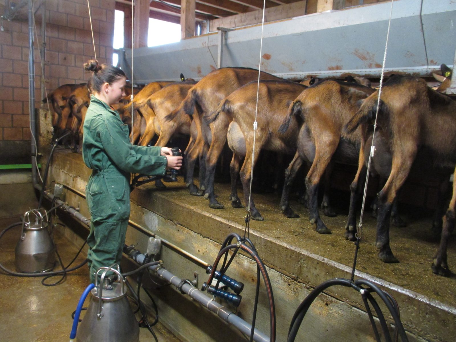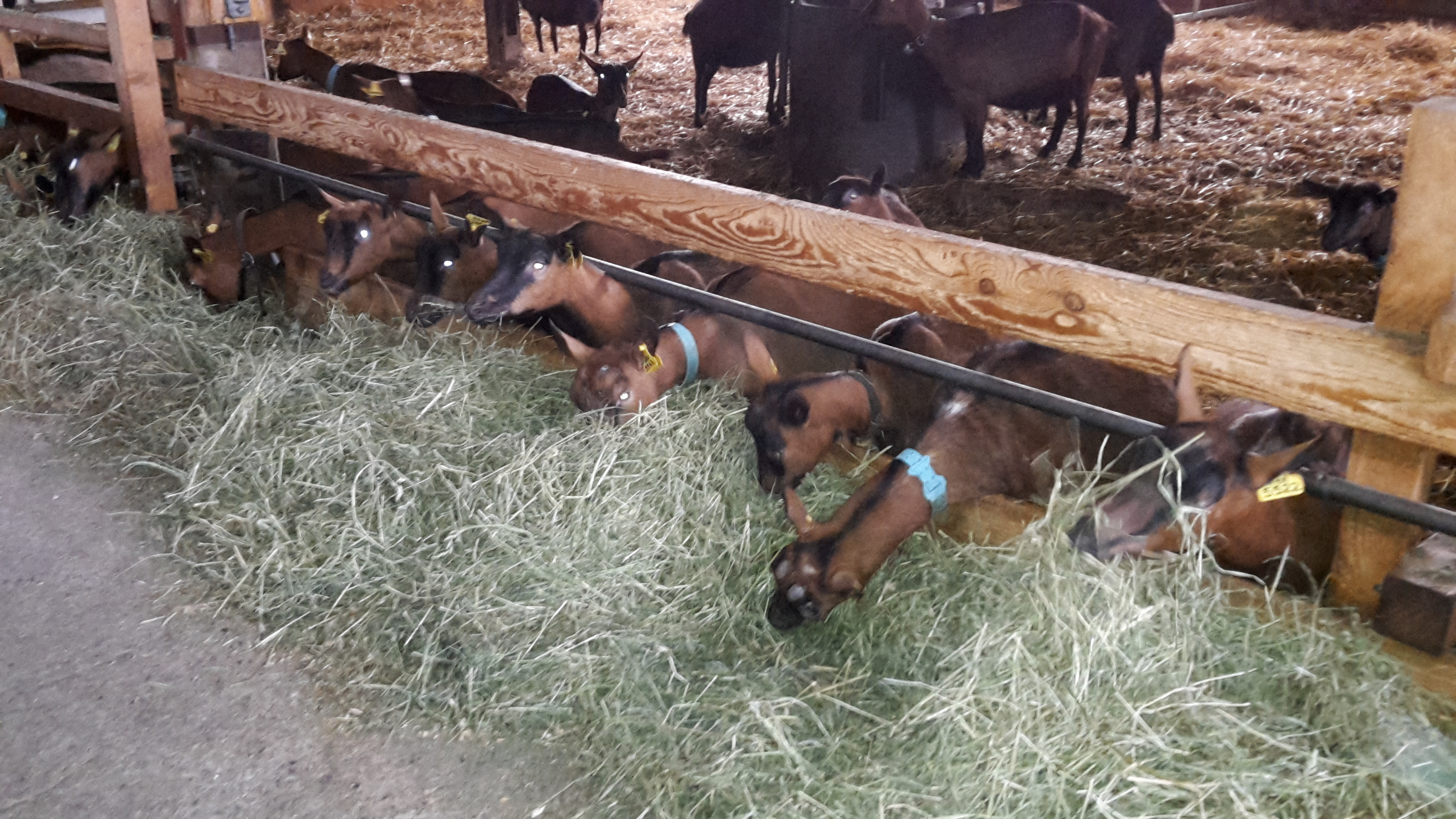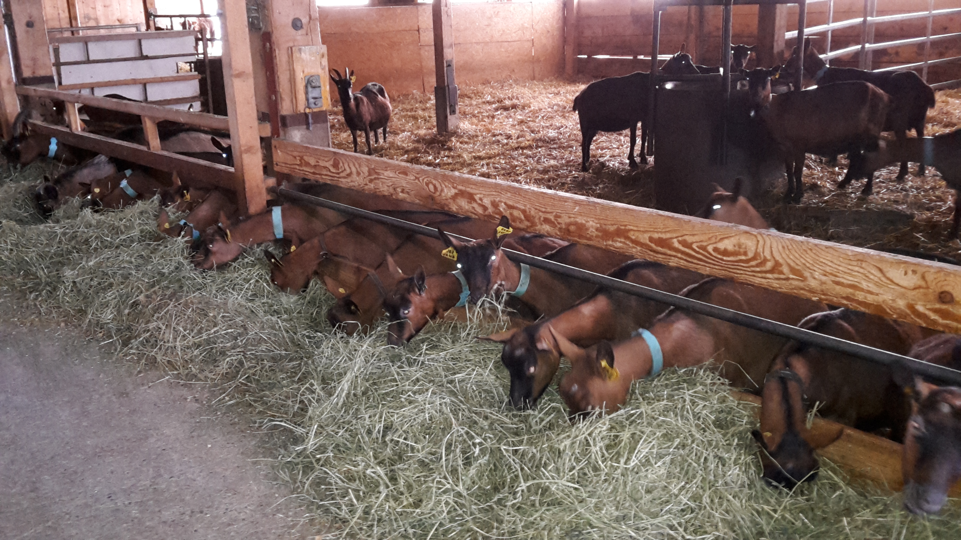 L’exploitation comprend environ 110 chèvres laitières, 4 boucs et 30 chevrettes d’élevage de race chamoisée. Les saillies se font uniquement par monte naturelle et pendant la saison de saillie (août à décembre). Afin d’améliorer la génétique et d’éviter la consanguinité, 1 bouc est acheté par année. Une fois par mois, le lait de chèvres est officiellement pesé et analysé afin de déterminer les composés et la qualité de celui-ci.