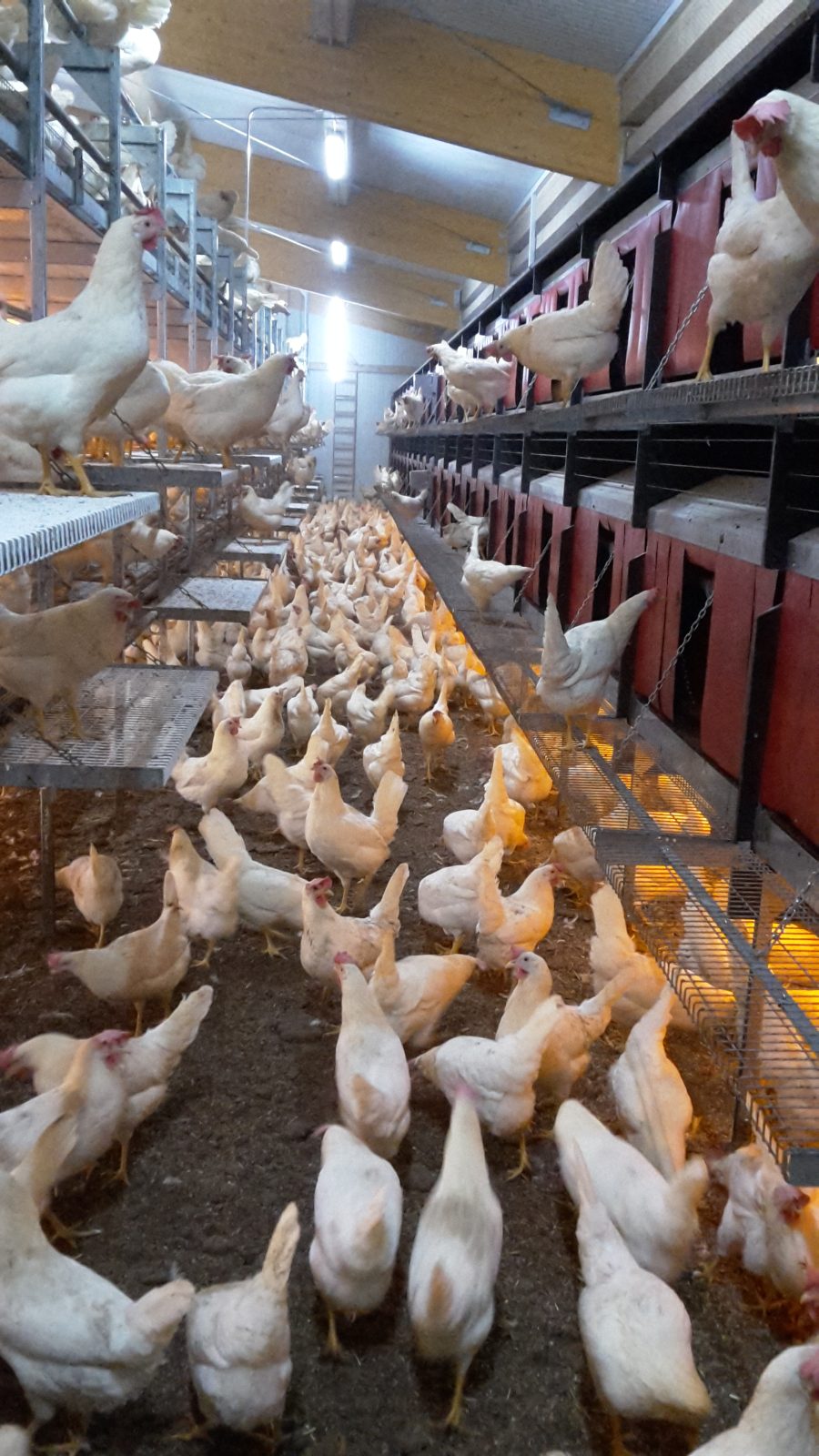 Un avantage de notre exploitation est que les poules pondeuses sont élevées par nous même dans un deuxième bâtiment. Ceci diminue les distances de transport et favorise une bonne santé des animaux, car elles peuvent rester sur l’exploitation après l’élevage.