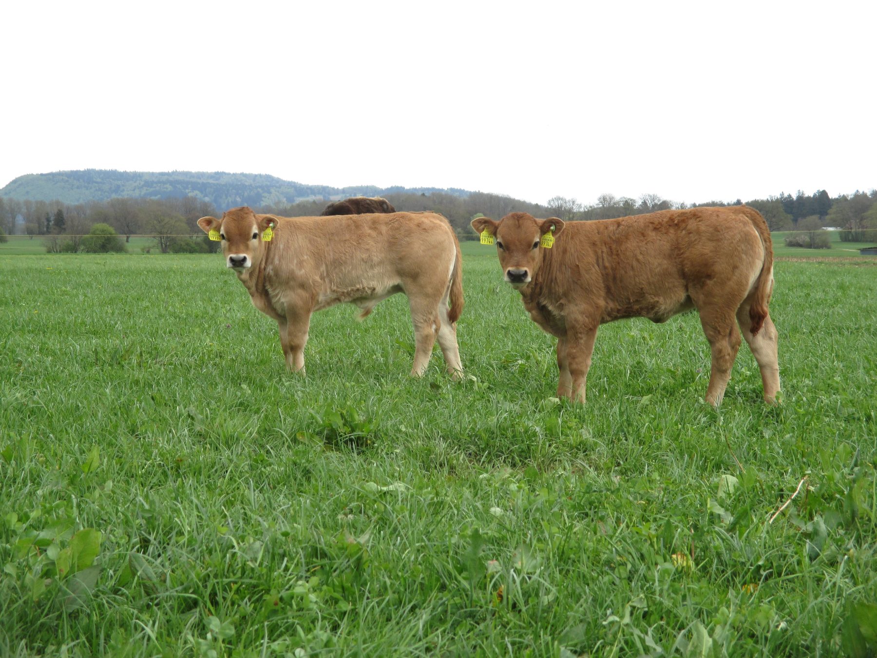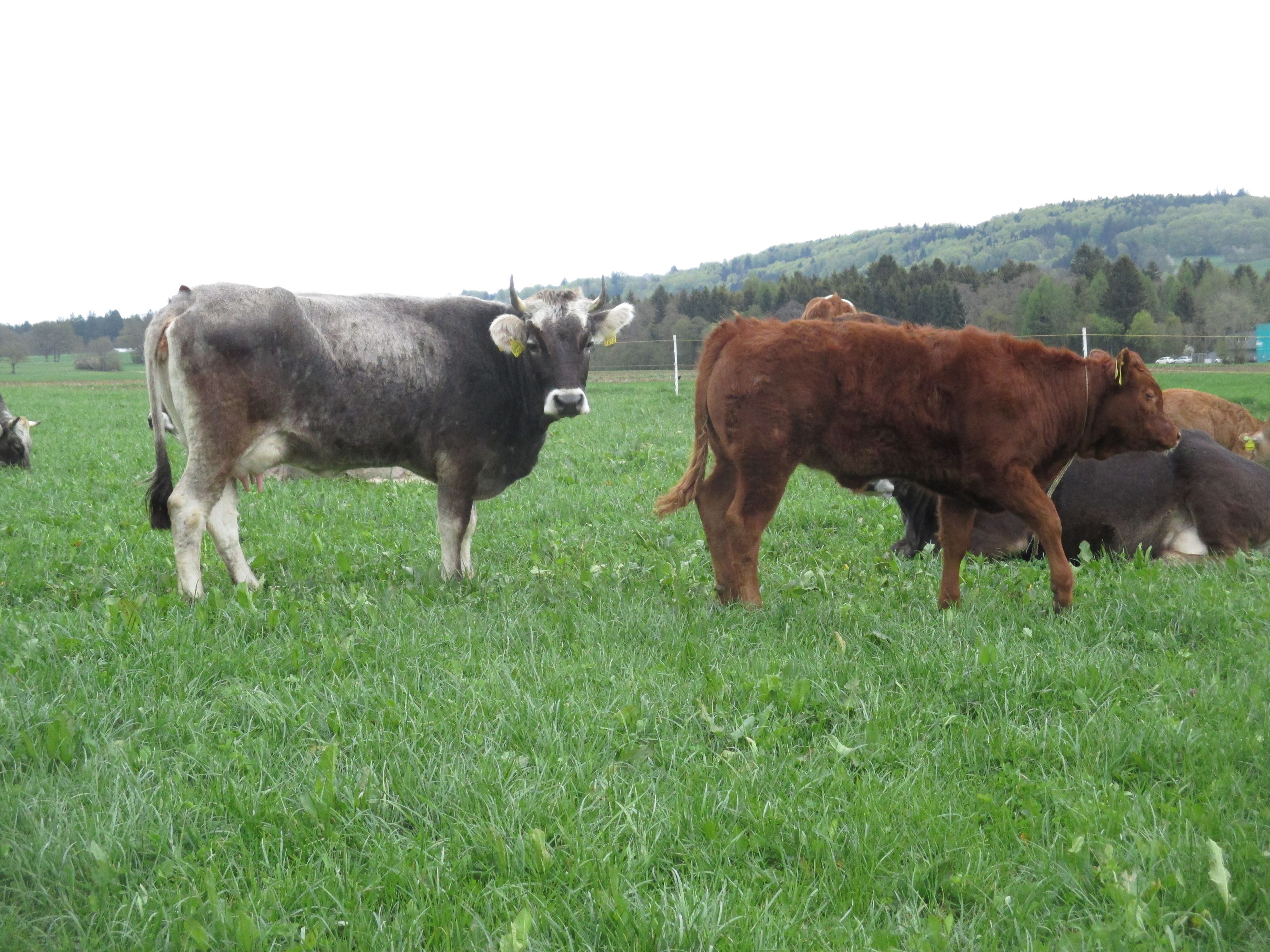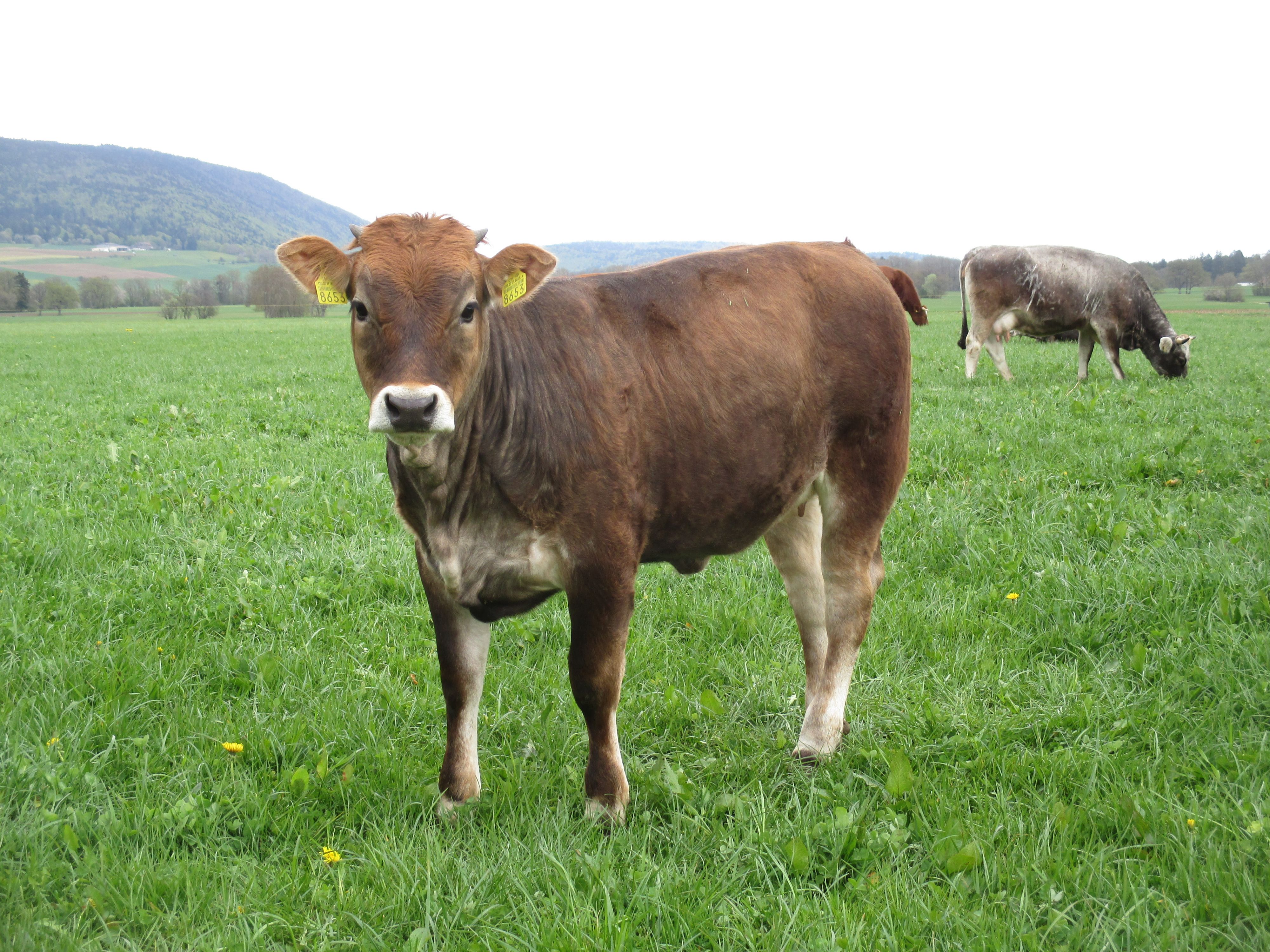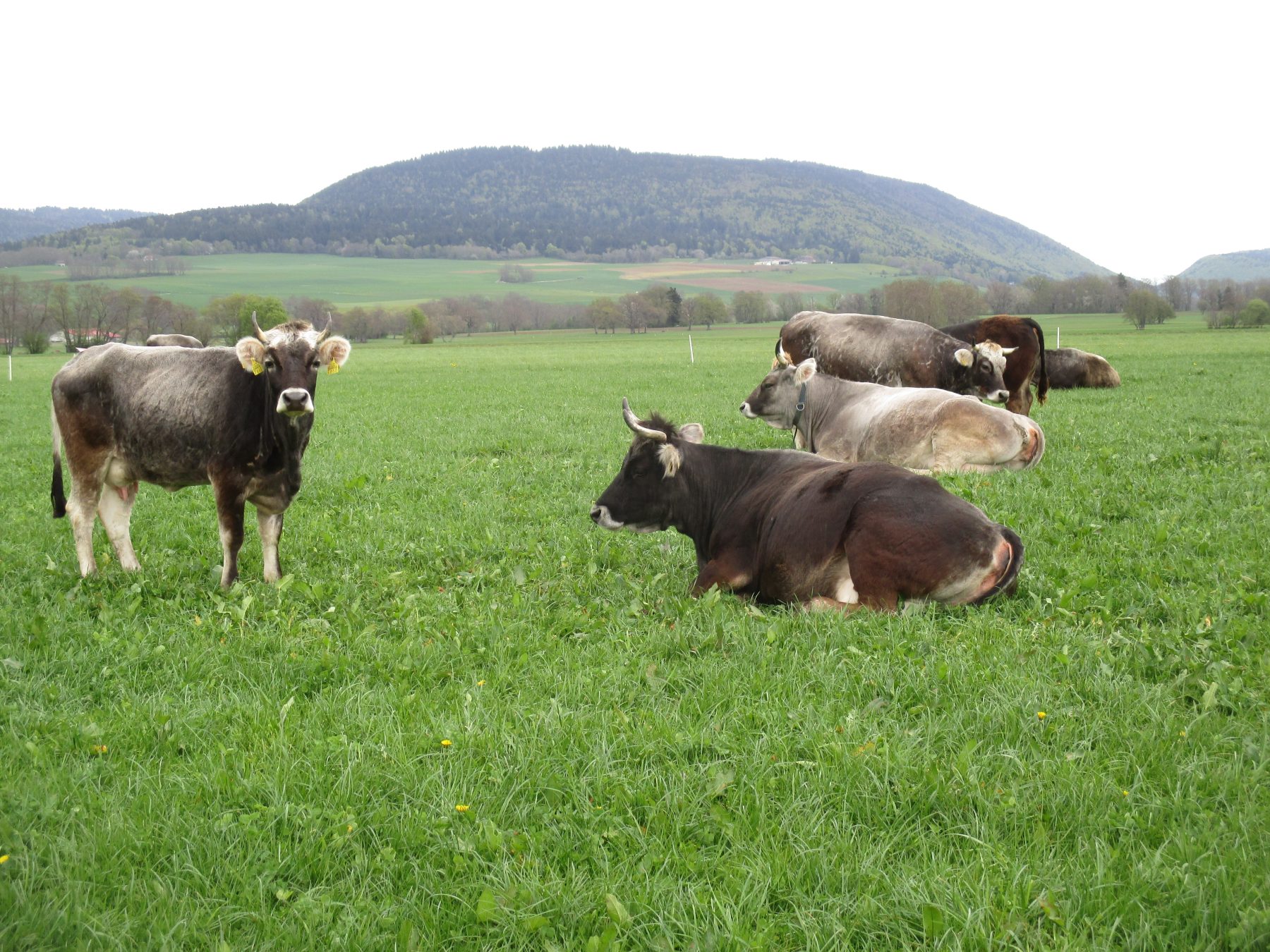 Les vaches allaitantes sont un complément idéal aux chèvres laitières. Comme ces dernières aiment laisser des restes de foins dans leurs crèches, ceux-ci peuvent facilement être revalorisés par les vaches allaitantes. Durant les mois d’été, les vaches et leurs veaux pâturent sur un alpage dans la région du Chasseral.