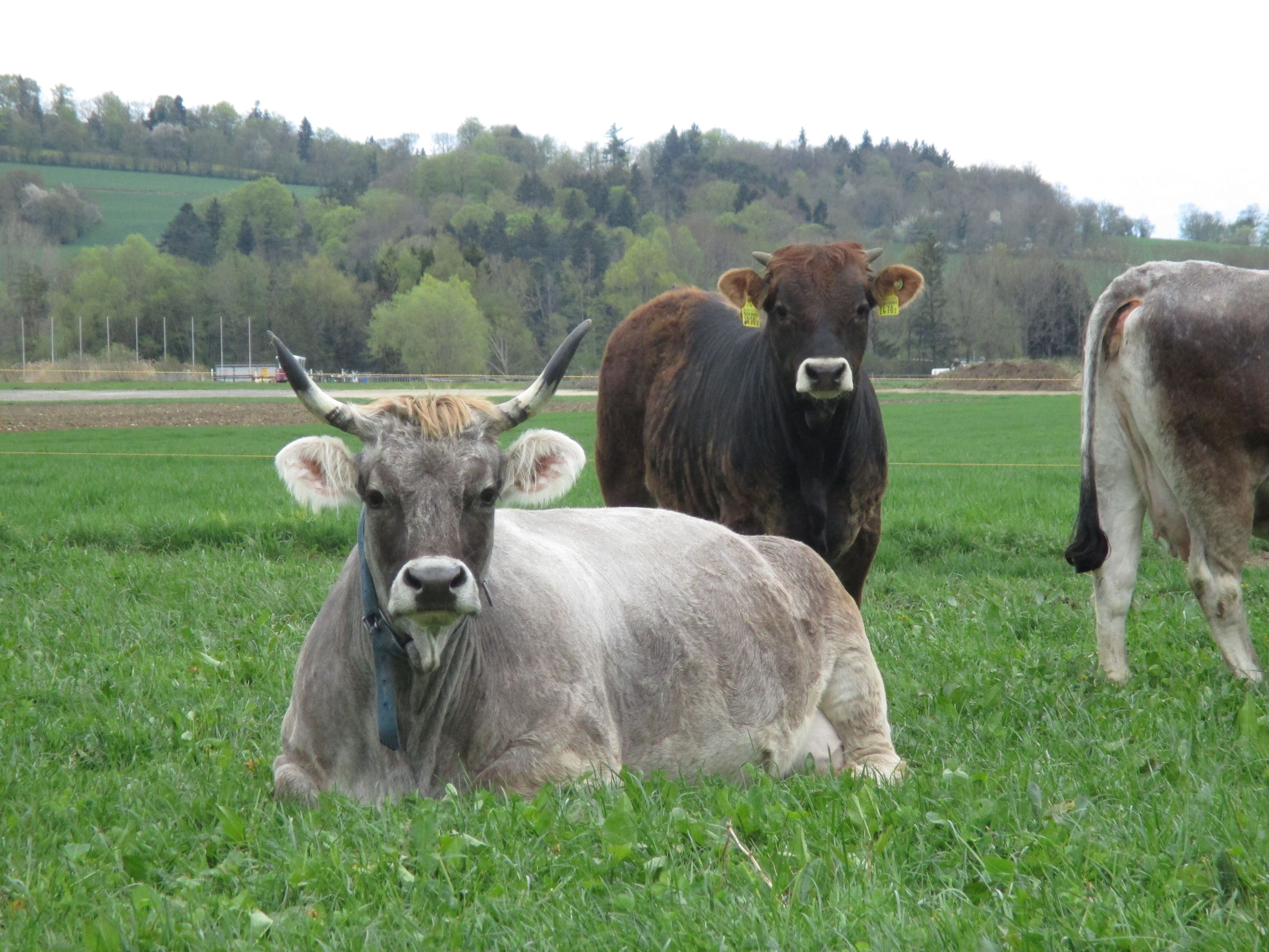 Le troupeau de vache allaitante est composé d’une dizaine de vache mère de race grise-rhétique. Ces vaches, en général de plus petite taille, se caractérisent par une très bonne valorisation des fourrages extensifs de base, tout en produisant assez de lait pour leur veau quelles allaitent durant 9 mois.